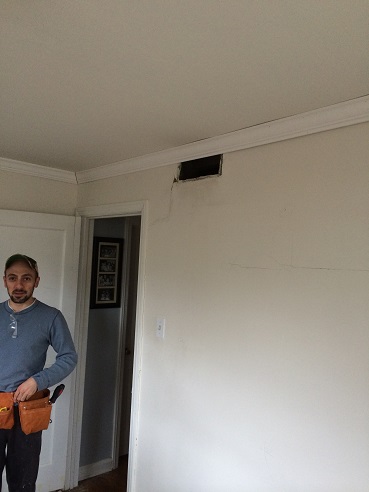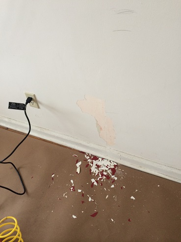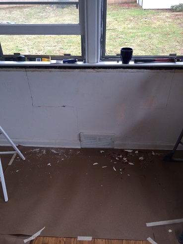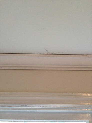 When Kelly and Kristin spent the weekend in Pittsburgh, Joe and Ardy stayed back and worked on the baby’s room getting up some crown molding, fixing the walls, putting up some chair rail. Prior to being the baby’s room, the room was Joe’s office since he worked from home for the last 5 years or so. This room had a treadmill that we never used, a few bookcases and tons and tons of junk. Here are some construction pics. We didn’t really do “construction” per say, but it was dirty.
