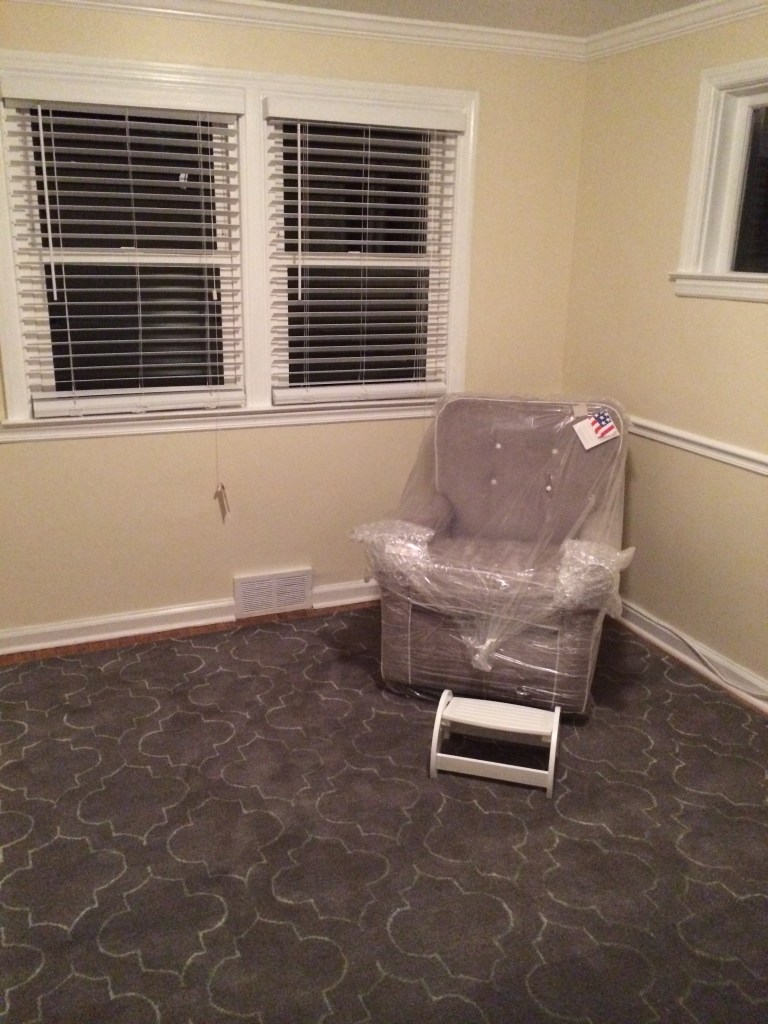 We have just recently finished “construction” on the baby’s room. We put in some new windows, added crown molding and chair rail courtesy of Ardalan, Bobby, and the fine folks at Rittenhouse Lumber. We painted the room a cream color, put in a new door and frame, bought two rugs but returned one, put up new blinds, and just recently got all of his furniture delivered (we don’t know if it’s a boy, but writing his or her every time is just too many letters).